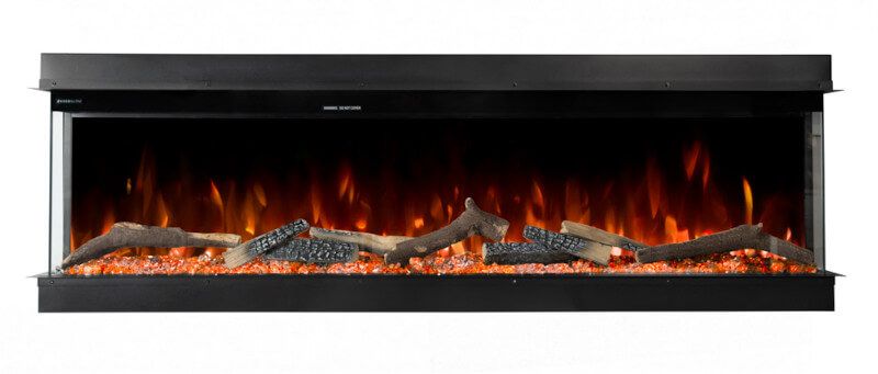 The E150R is the ultimate media wall fire and is a part of the Ellere electric range. The fire will be the focal point of your home thanks to a beautiful landscape design with lifelike flame effects and fuel bed decorations like ceramic logs, charred wood pieces, and crystals. You have the choice of installing the fireplace in your home with 1, 2, or 3 glass sides.