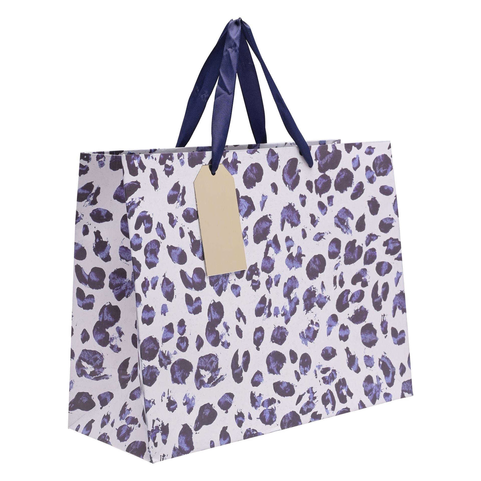 - The gift bag showcases a vibrant animal print on all sides, complete with blue internal colouring.