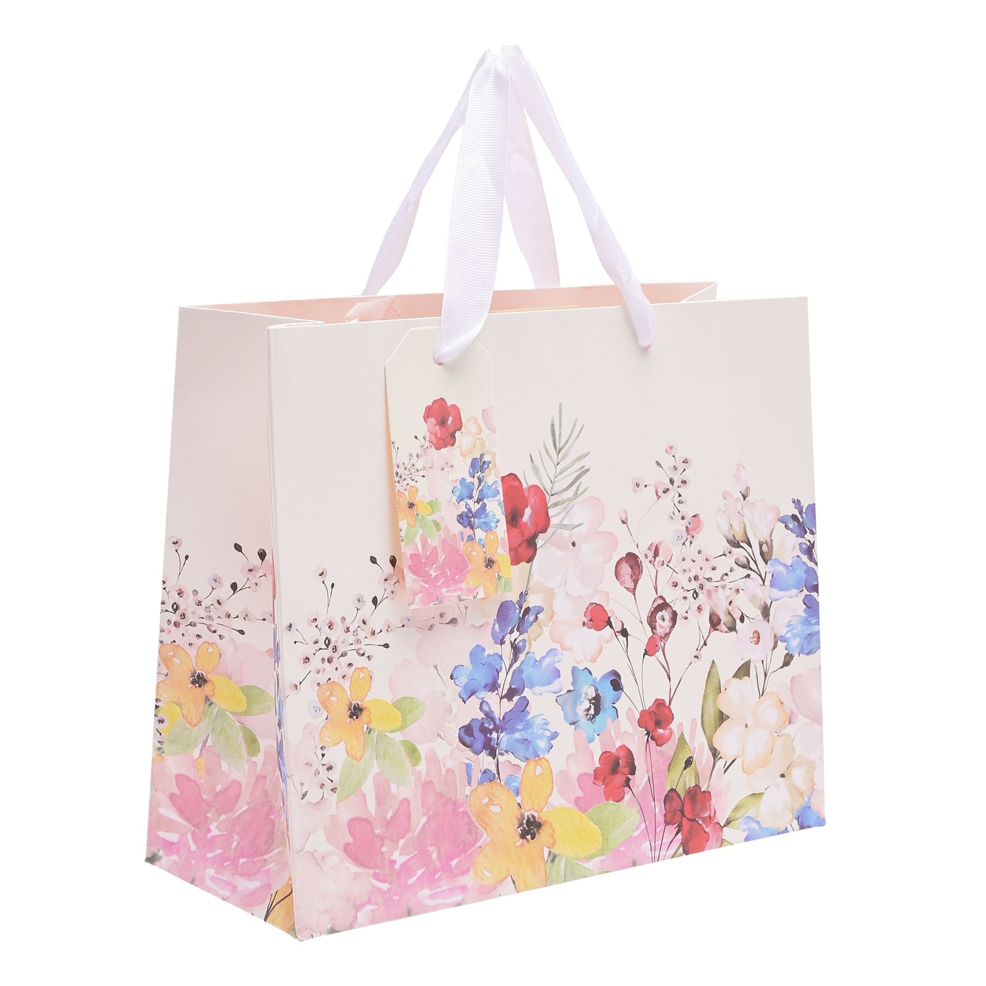 - The gift bag showcases a beautifully floral design on all sides, complete with pink internal colouring.