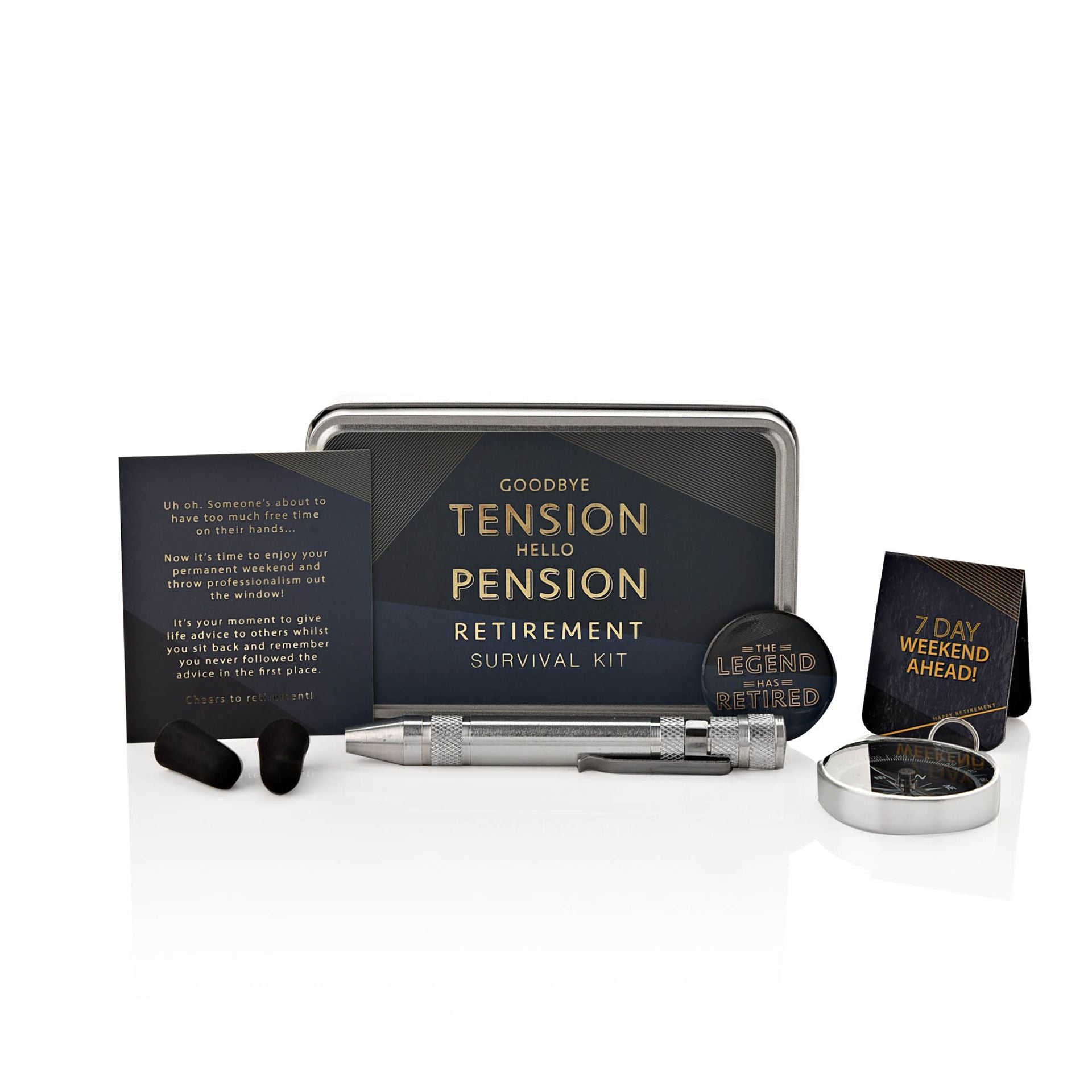 - A perfect retirement gift idea for any legendary man in your life, this survival kit tin features lots of goodies including ear plugs (to enjoy the ignorant bliss of retirement), and a compass (to find your way to the sofa.)