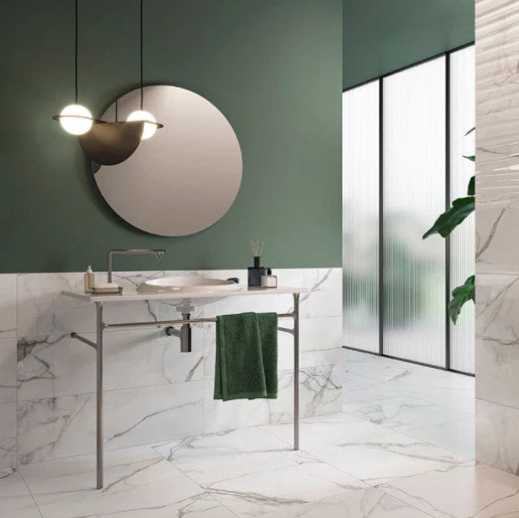 Traditional marble is given a contemporary styling with the complementary decor tile with it's soft, undulating waves.