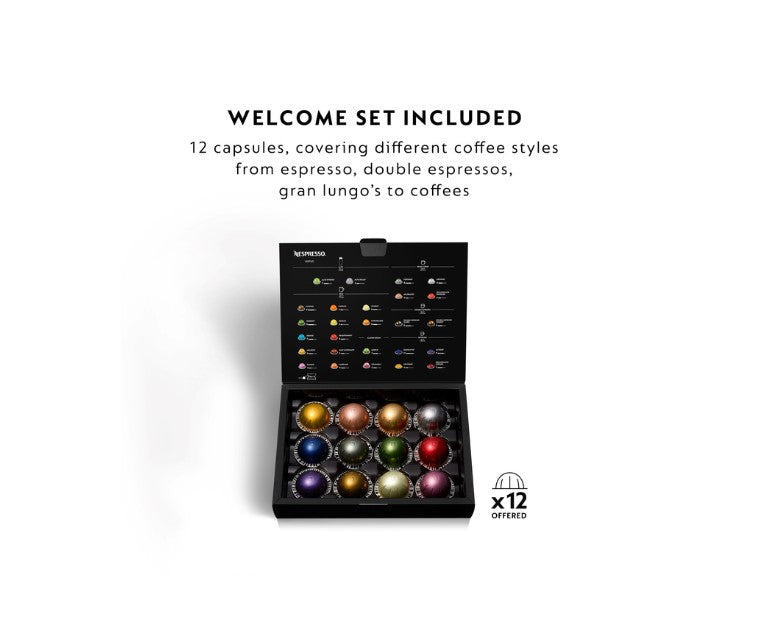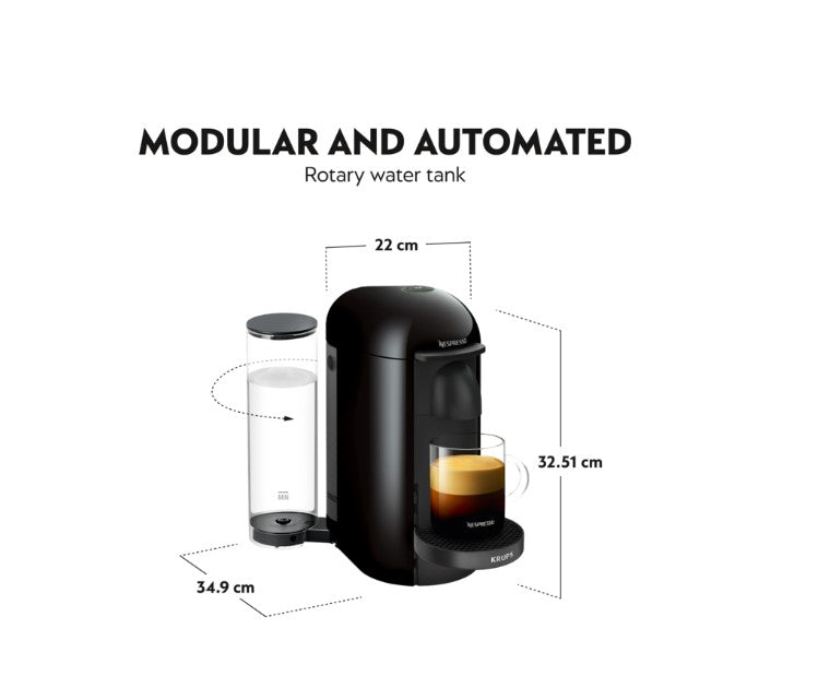 Form always follows function with Nespresso's Vertuo Plus coffee machine. With chromed accents on the Deluxe models and a movable water tank, it's sure to fit into your kitchen, and your quality coffee brewing needs. Lightly press on the lever to open its automated head. Slide in a Vertuo coffee pod and let the Nespresso Centrifusion™ Technology spin the capsule up to 7,000 times a minute. Transforming ground coffee into a rich brew, with the crema to match. By reading each coffee pod to adapt the extraction parameters, it fully reveals each capsule's hidden treasures. You're invited to experience 4 coffee cup sizes, from exciting Espressos (40 ml/1.35 oz single, 80 ml/2.7 oz double), to balanced Gran Lungos (150 ml/5 oz) or indulgent mugs (230 ml/8 oz). To new brewed coffee horizons.