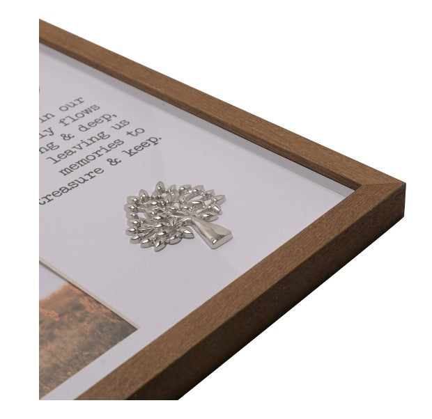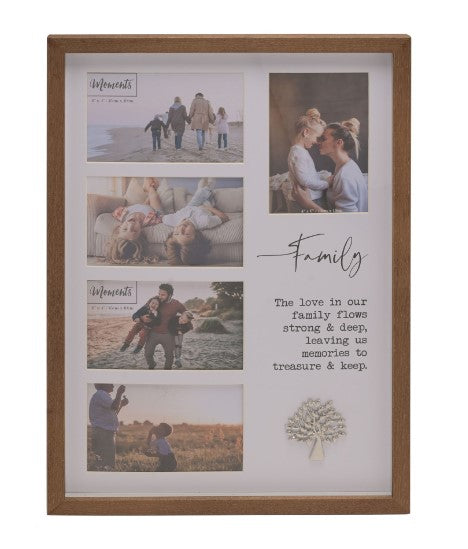 - The large wooden frame showcases a natural finish, complete with 3D silver metal tree embellishment and ‘Family’ verse. The wall hanging frame provides five apertures: one portrait and four landscape.